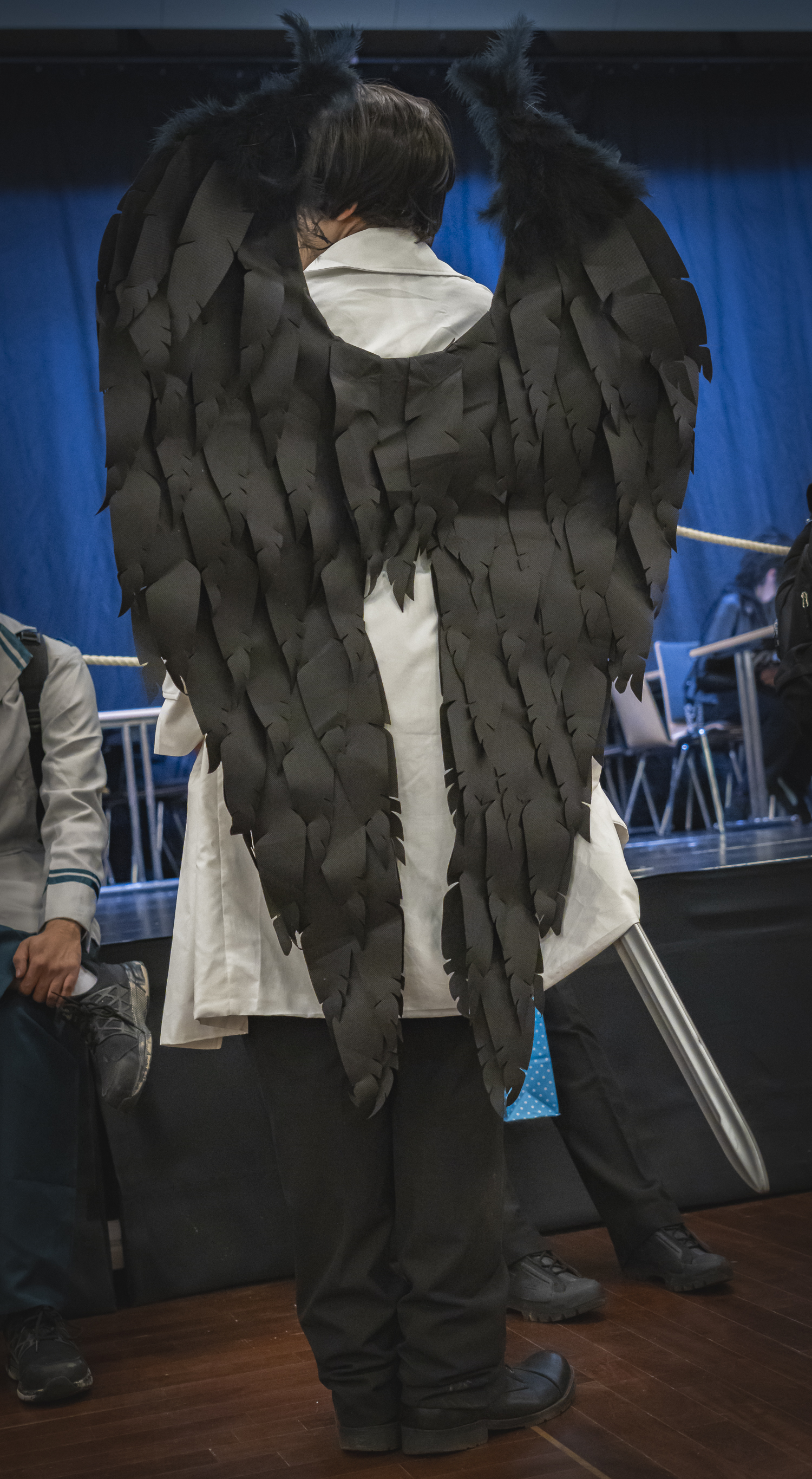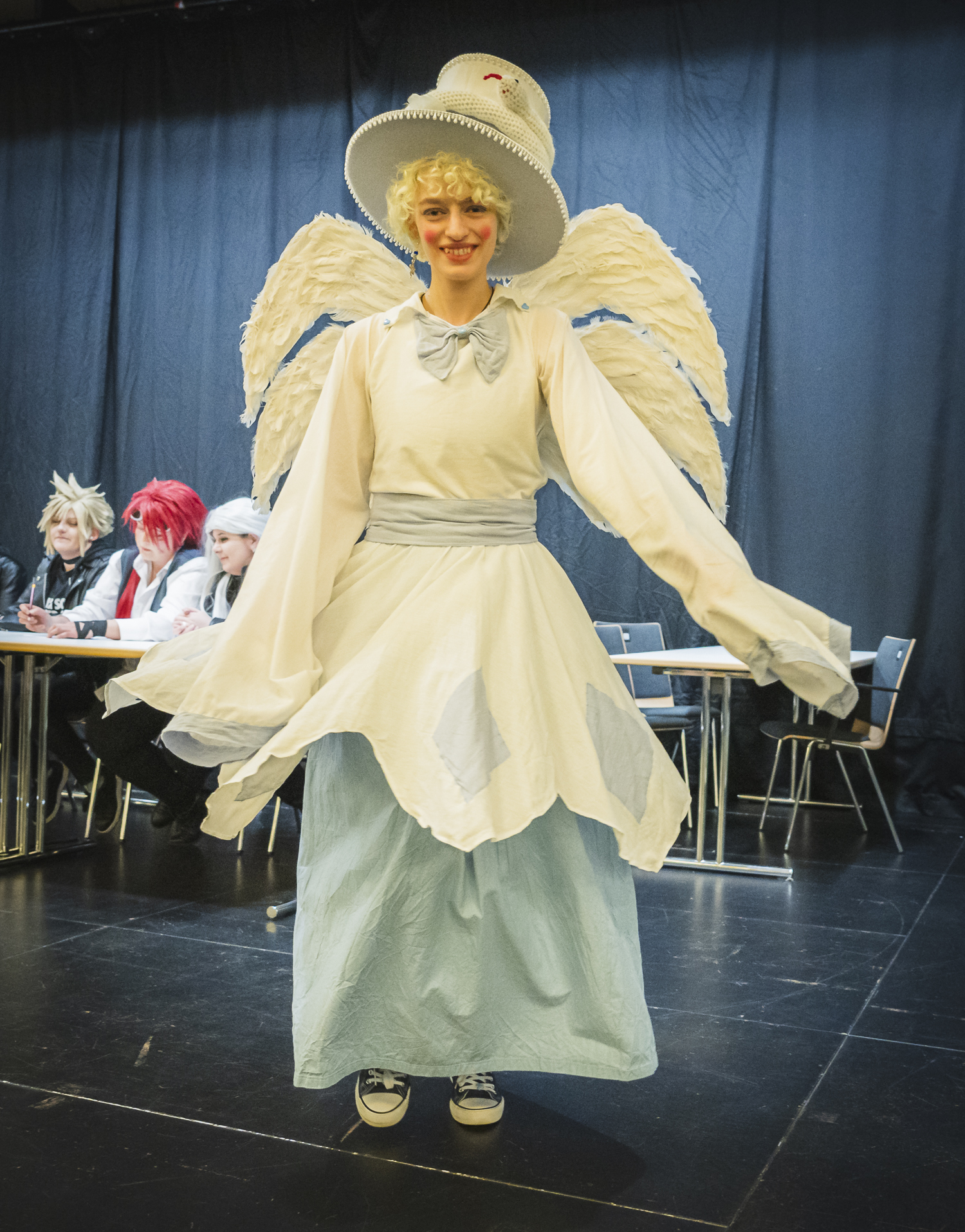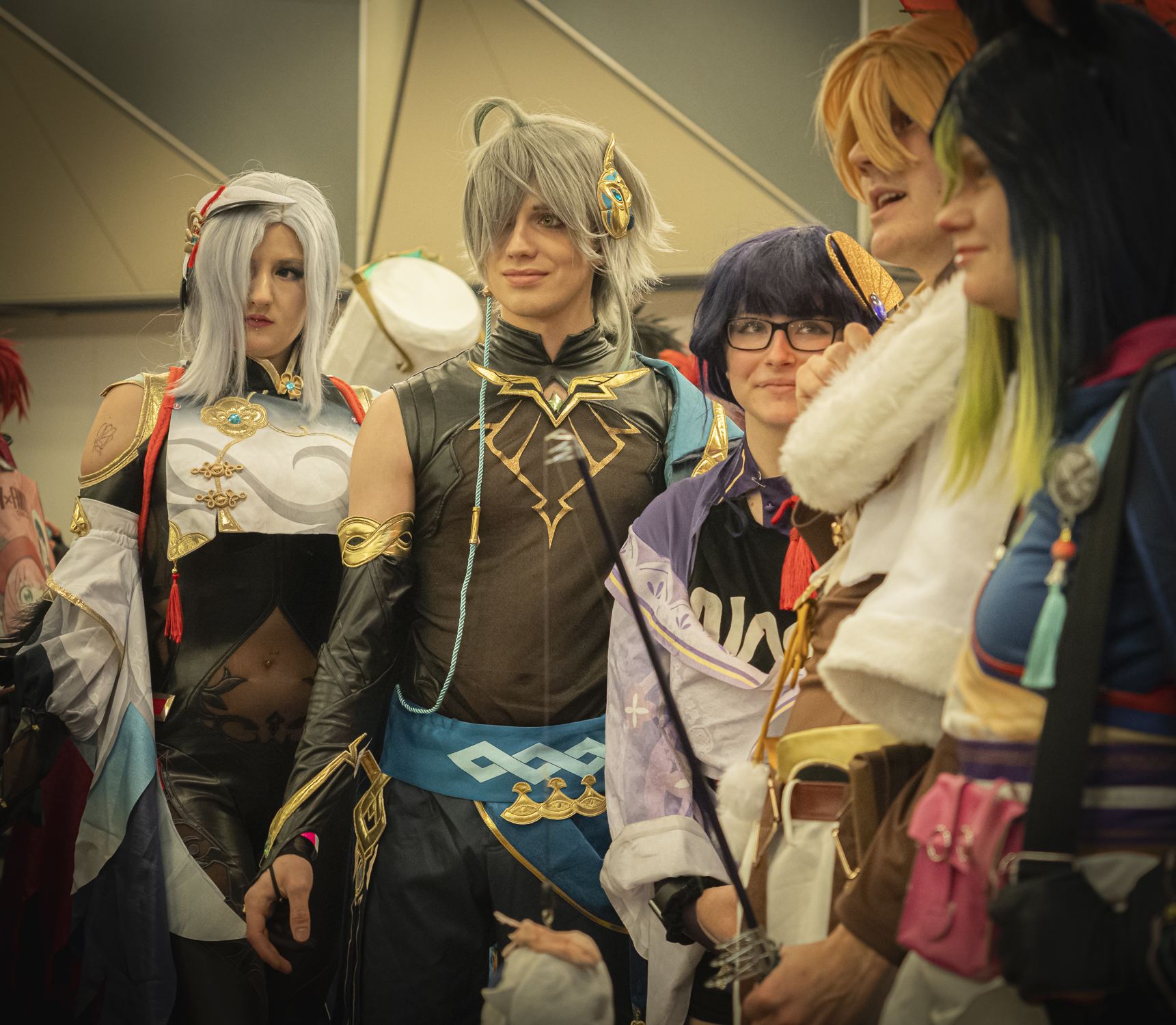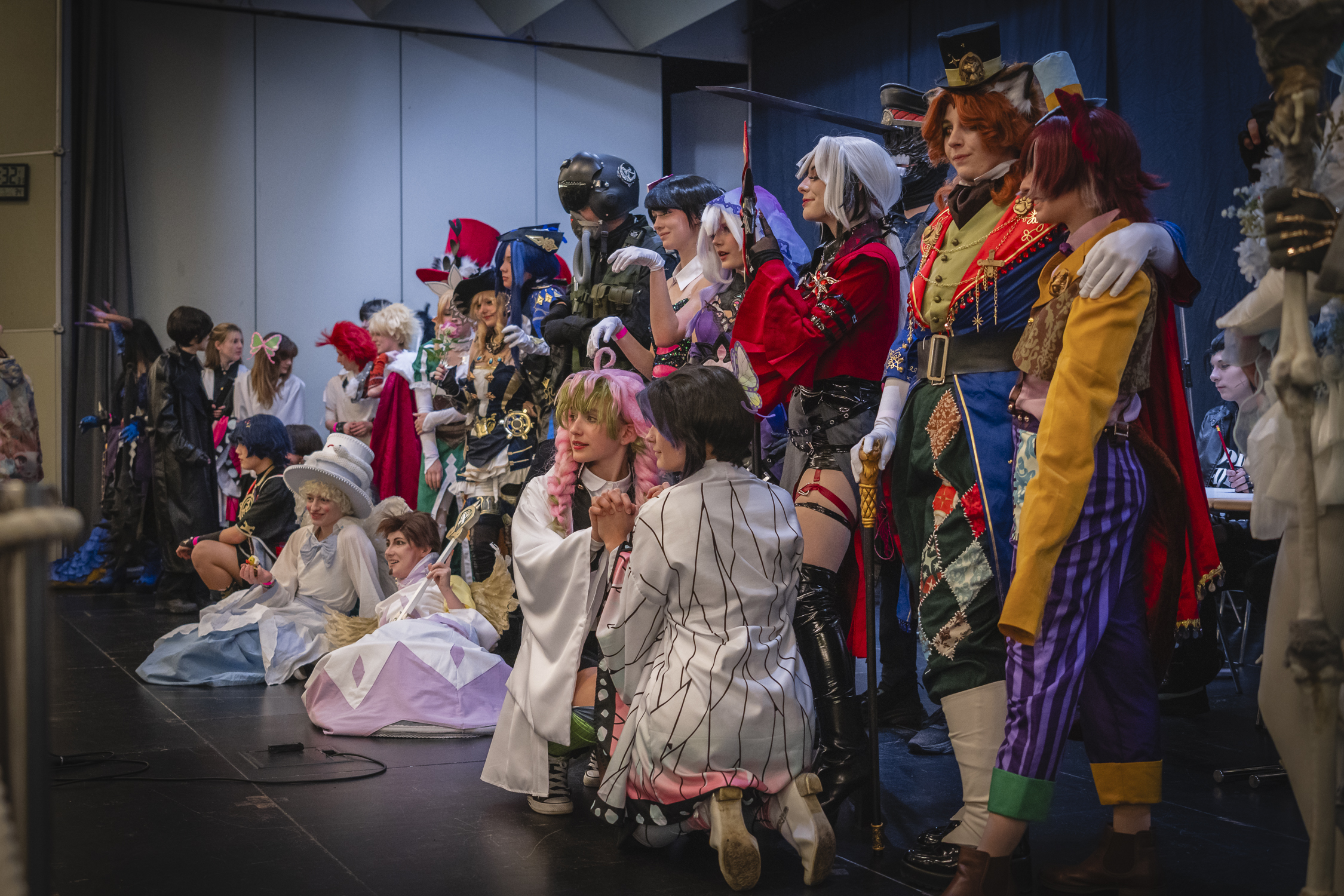 Ein weiterer Höhepunkt war der Cosplay-Wettbewerb, der auf einer großen Bühne stattfand. Die Teilnehmenden präsentierten sich und ihre Kostüme einzeln oder zu zweit und wurden sehr euphorisch vom Publikum empfangen. Dabei schien es weniger um einen Gewinn zu gehen, sondern vielmehr um die Freude am Mitmachen und den Austausch mit Gleichgesinnten. Die Begeisterung im Publikum war ansteckend, und ich bewunderte die Vielfalt und Kreativität der Kostüme. Hier das abschließende Gruppenfoto mit allen Teilnehmenden: